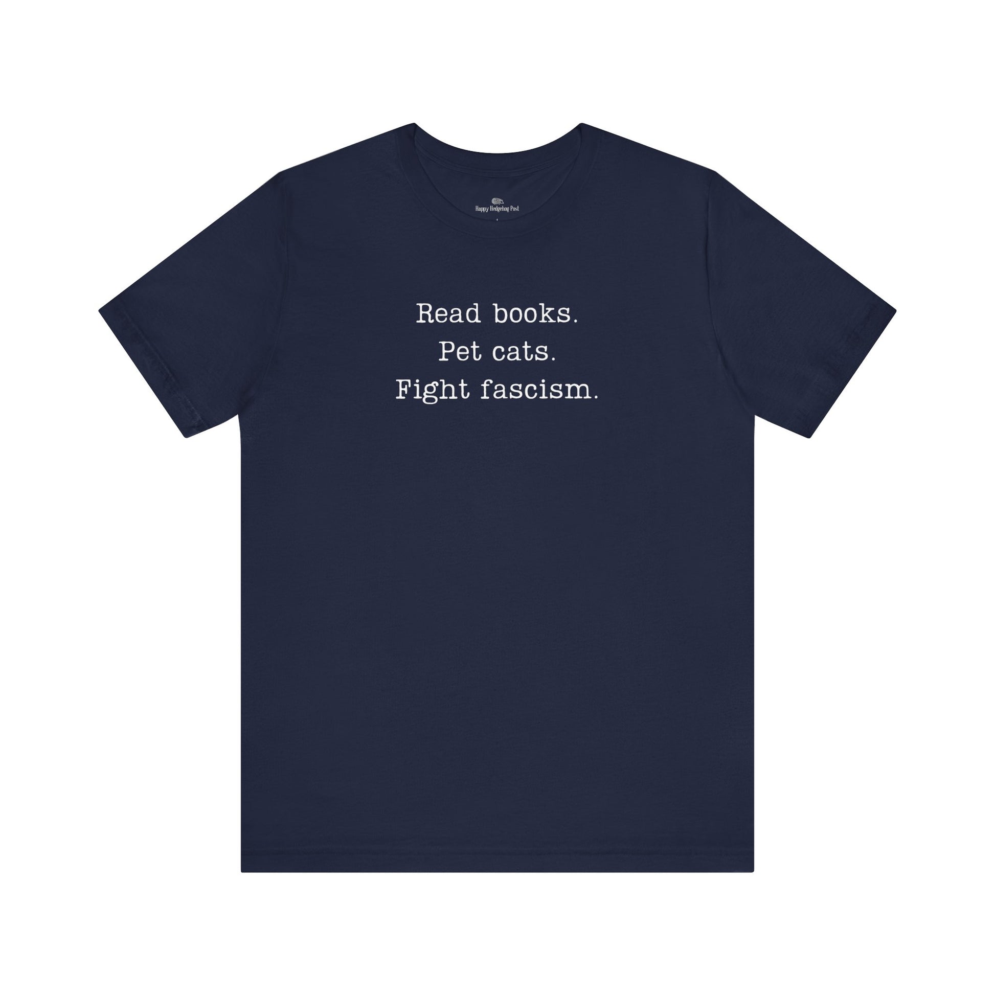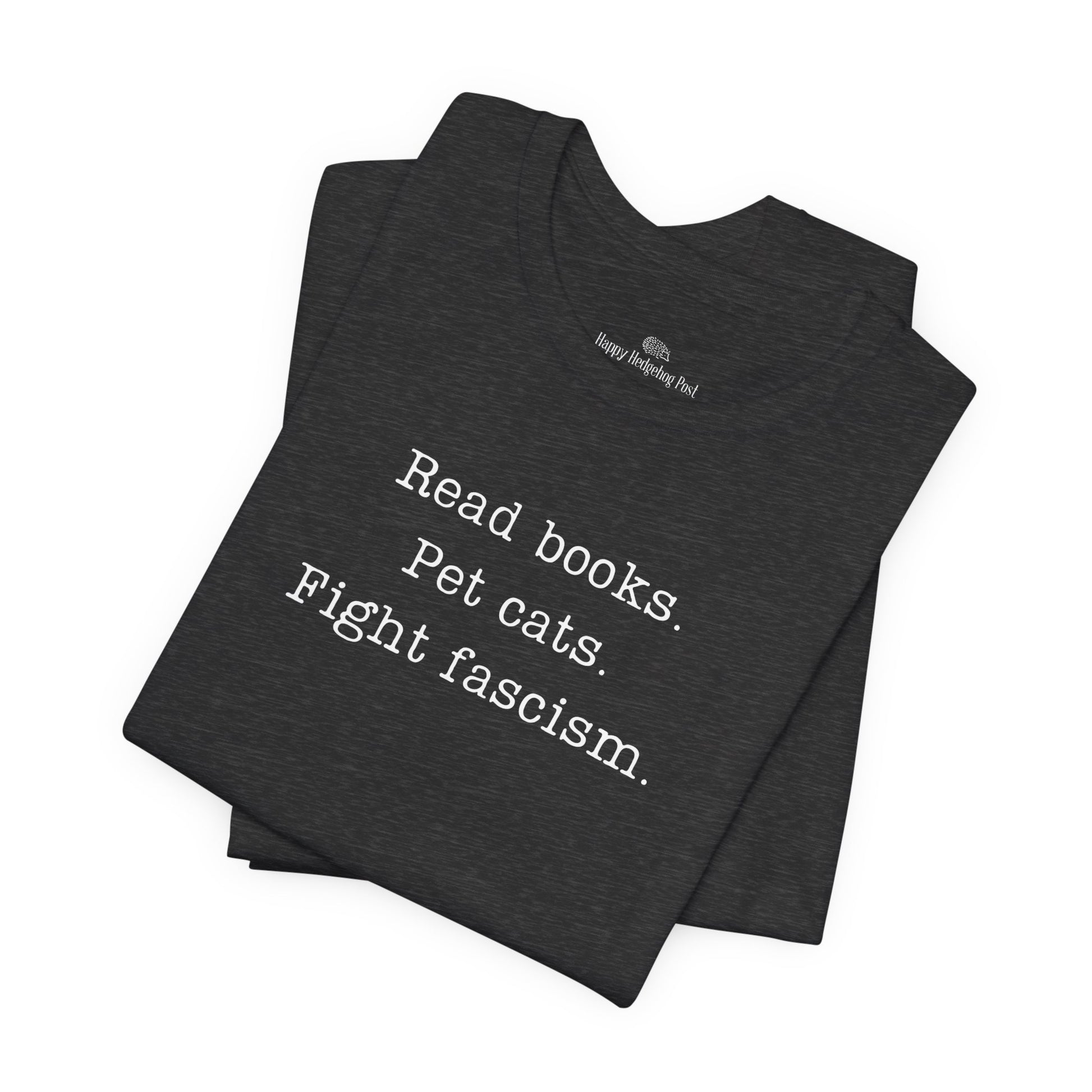 This shirt gets it: Read Books, Pet Cats, Fight Fascism. Simple typewriter font that reminds us the small comforts - a good book, a purring cat - are exactly what we need to fight another day.