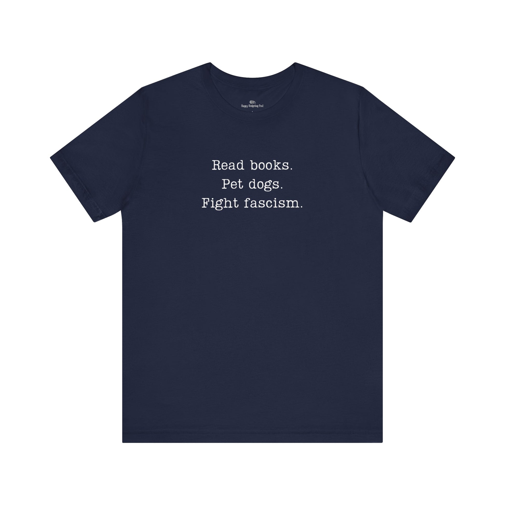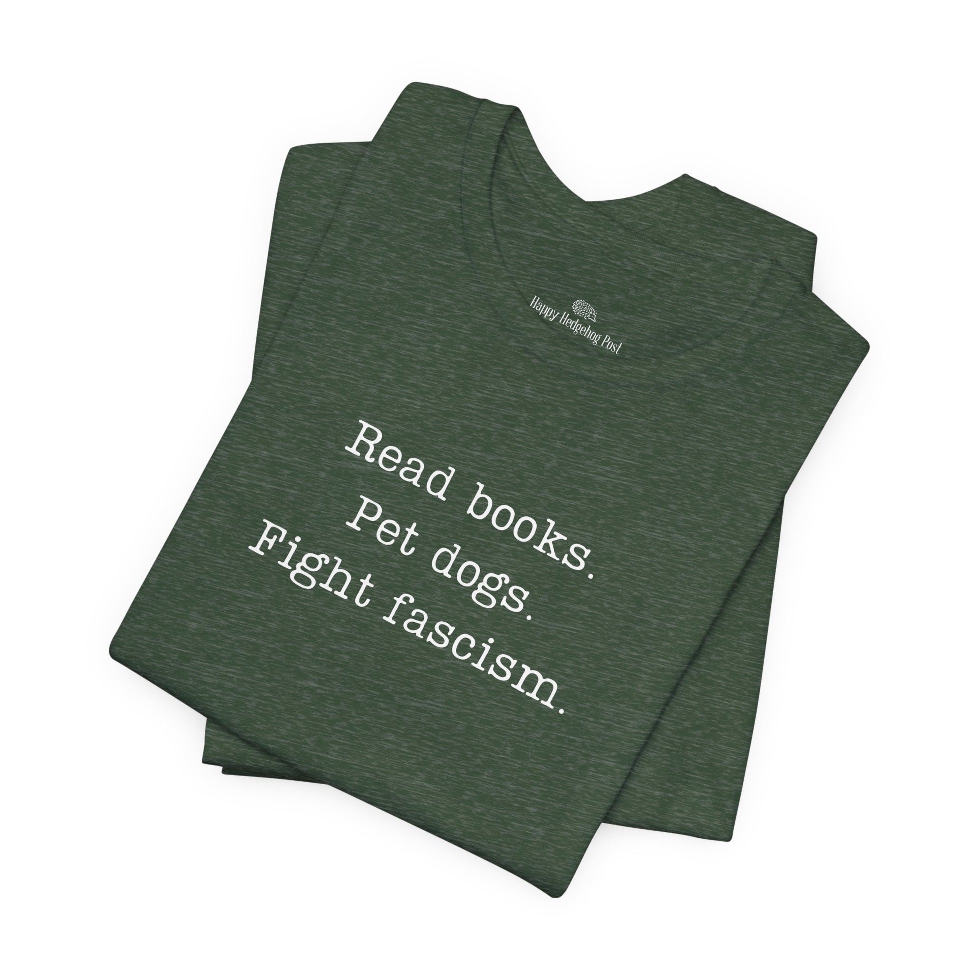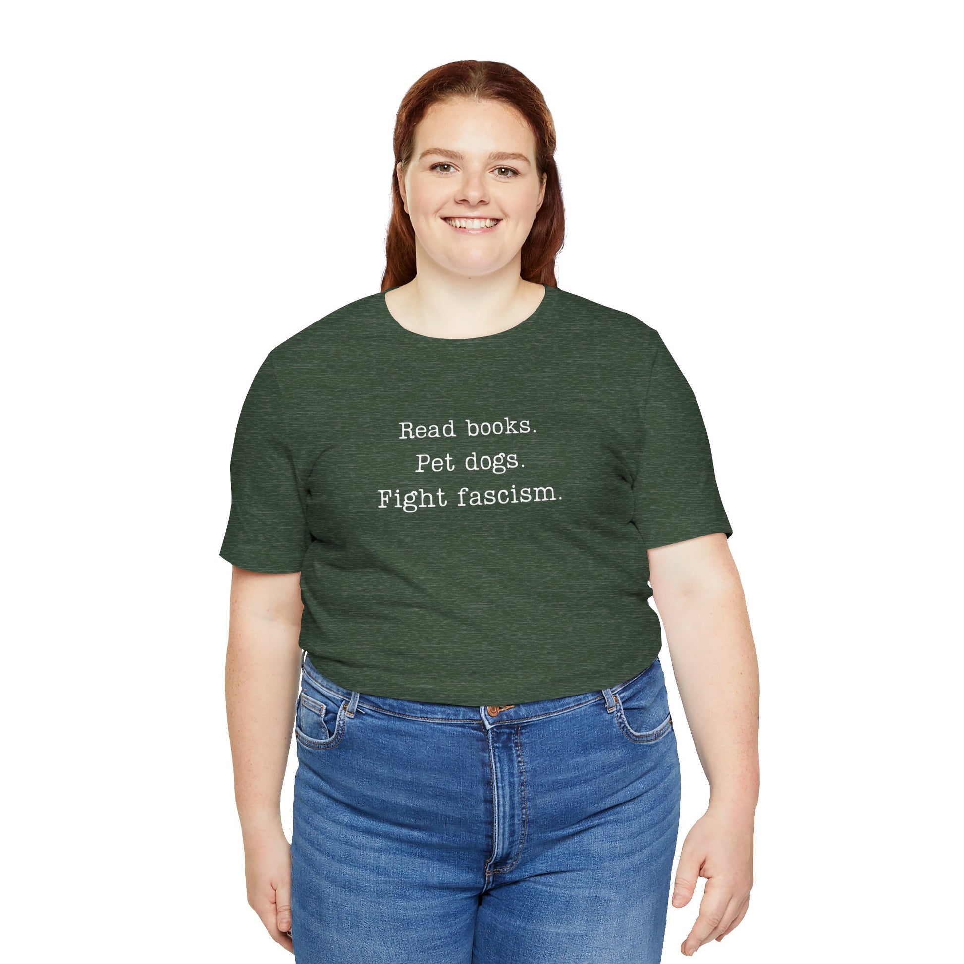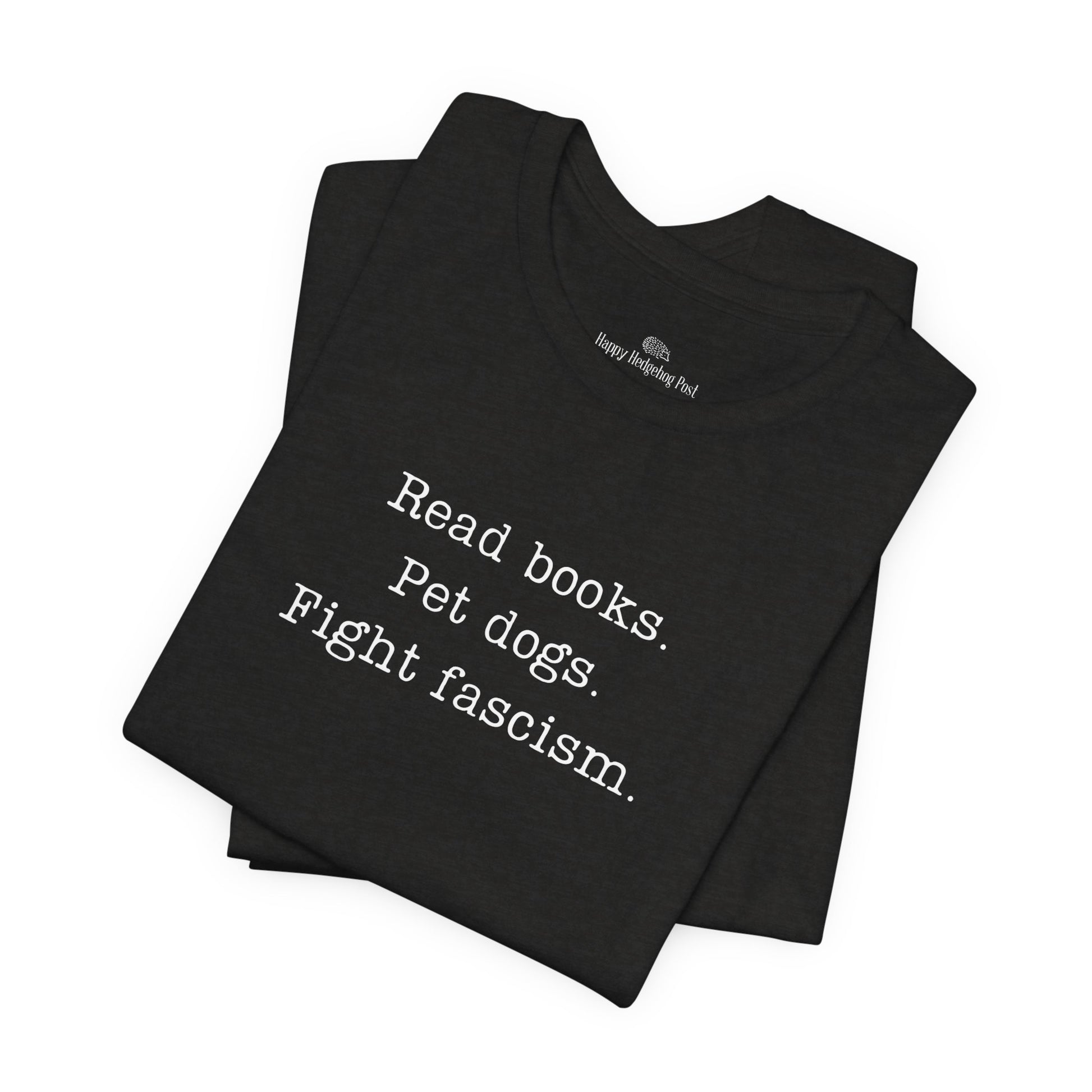 This shirt says it plain: Read Books, Pet Dogs, Fight Fascism. Clean typewriter font that reminds us we're not fighting to make life harder - we're fighting to protect the simple freedom to live it. To take your dog to the park without fear. To read what you want without looking over your shoulder. To build a life where kindness isn't radical and safety isn't conditional.