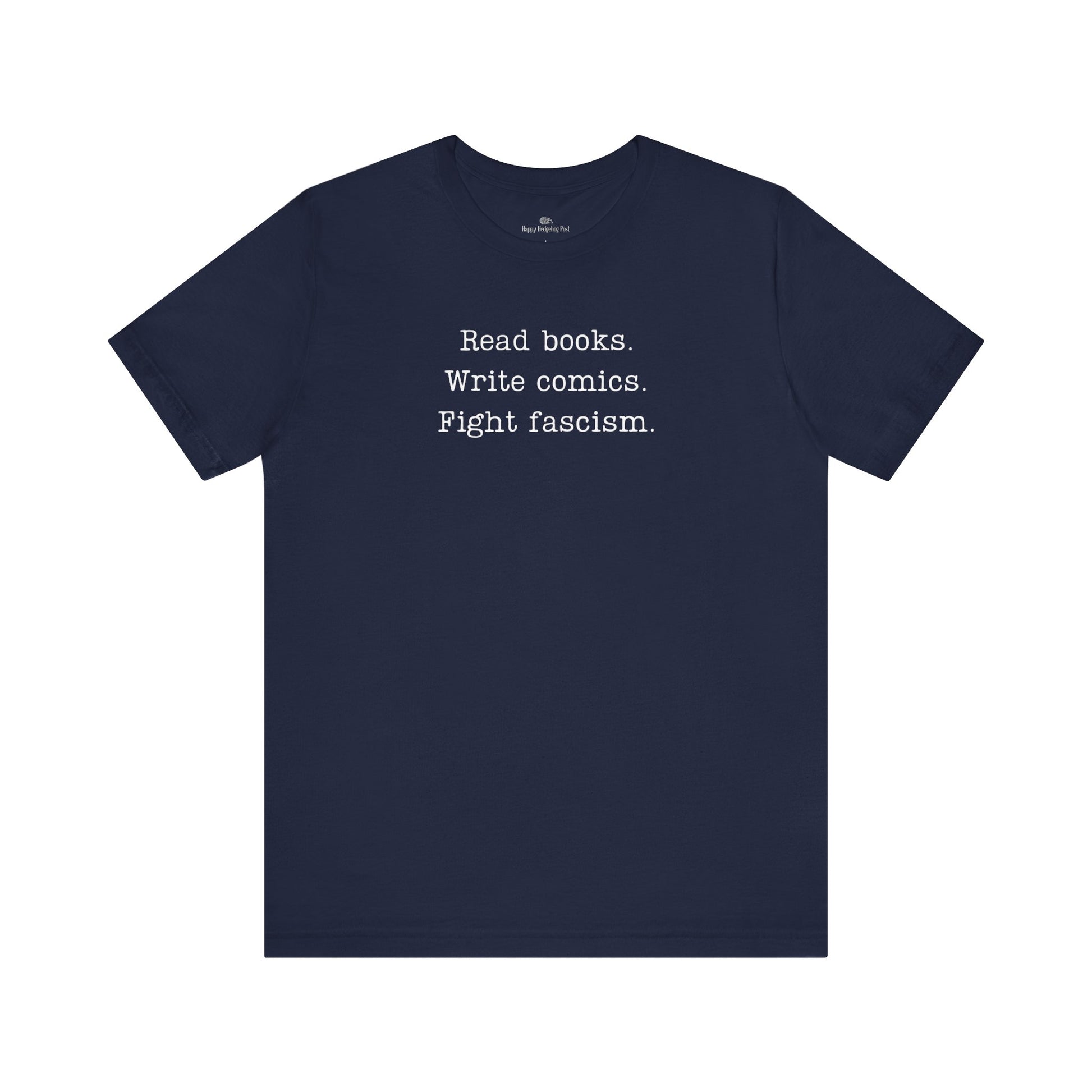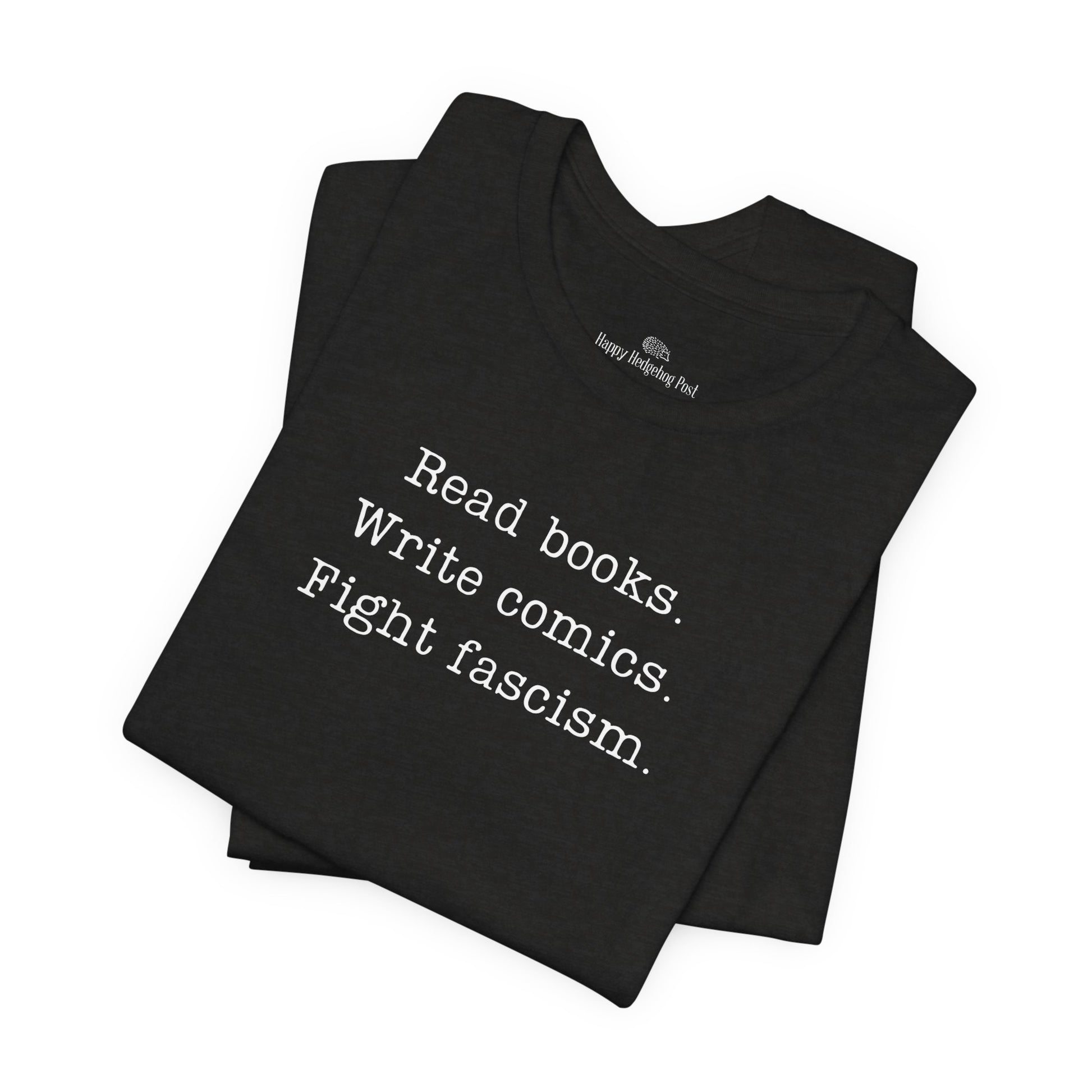 This shirt lays it out plain: Read Books, Write Comics, Fight Fascism. Clean typewriter font that doesn't hide what this is about. Because consuming stories isn't enough anymore. We need people creating them too. We need voices that refuse to be silenced and artists who won't back down when the censors come knocking.