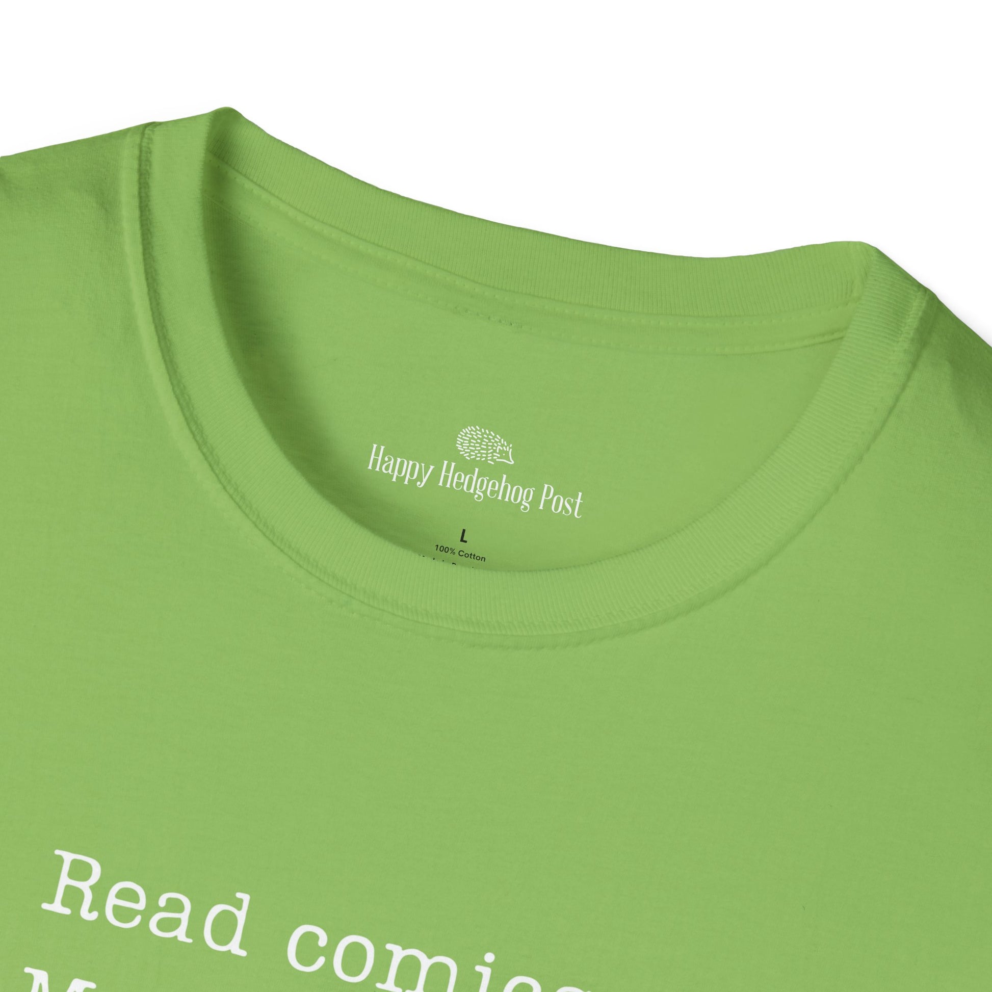 Express your love for reading comics, creating art, and standing against fascism with this tee shirt featuring a white typewriter font on a variety of colored tees. Perfect for adults who appreciate unique and meaningful graphic tees, this shirt is ideal for casual wear, art events, protests, and comic conventions.